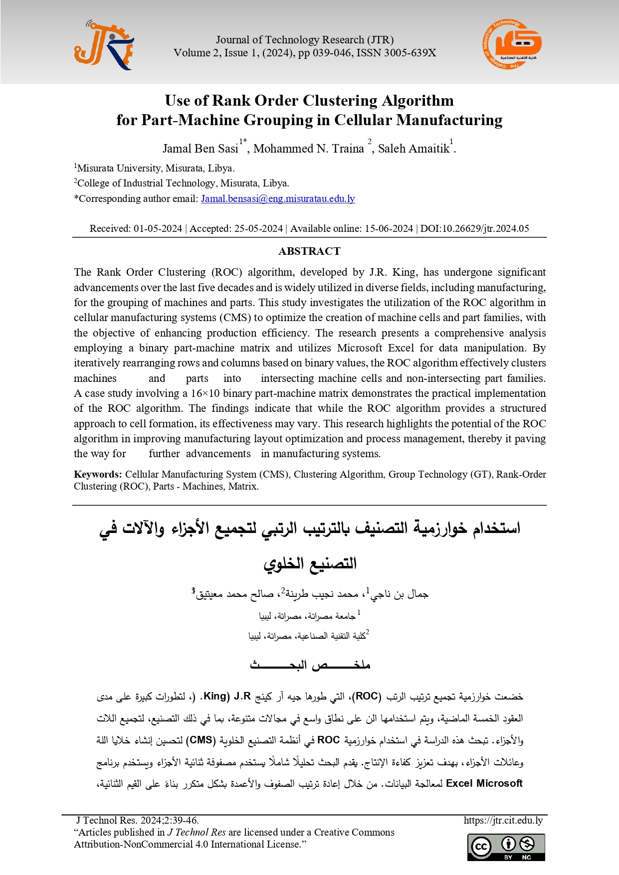 Cellular Manufacturing System (CMS), Clustering Algorithm, Group Technology (GT), Rank-Order Clustering (ROC), Parts - Machines MatrixAbstract