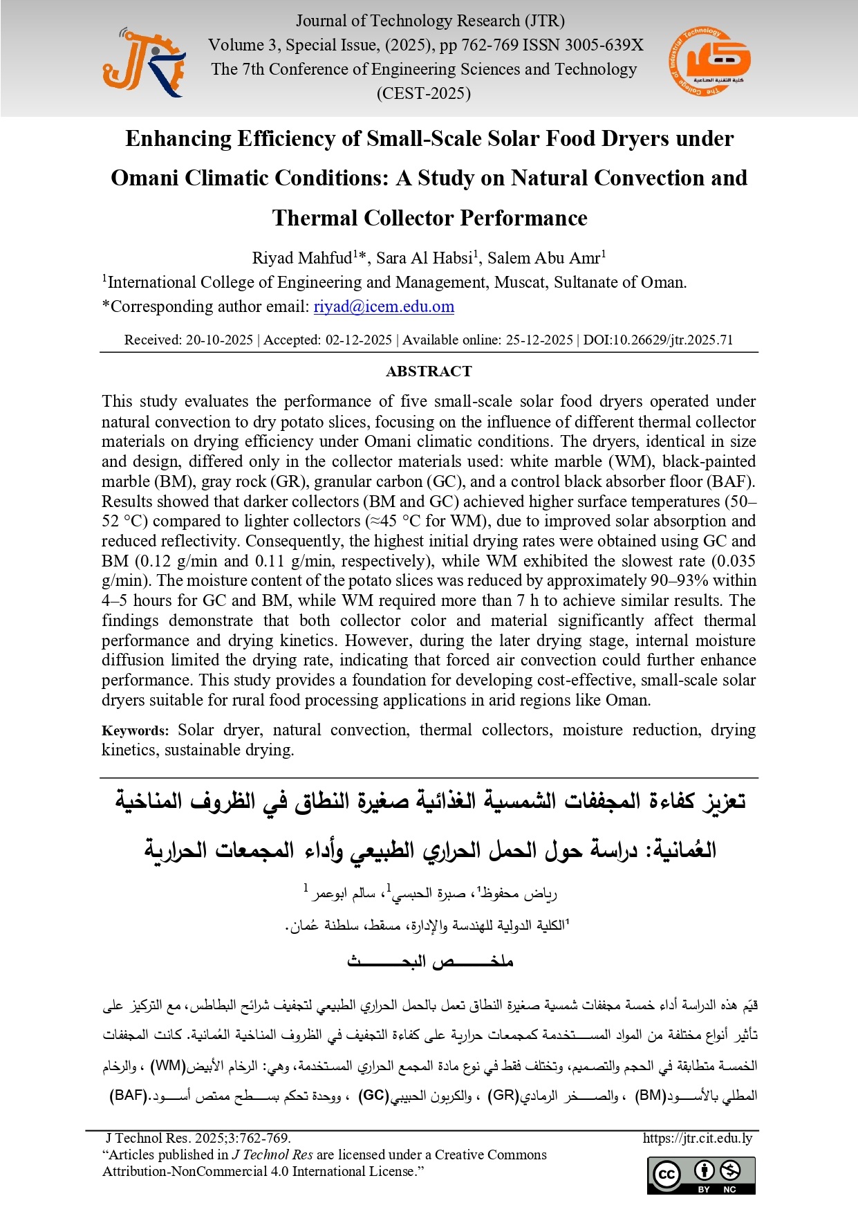 Enhancing Efficiency of Small-Scale Solar Food Dryers under Omani Climatic Conditions: A Study on Natural Convection and Thermal Collector Performance