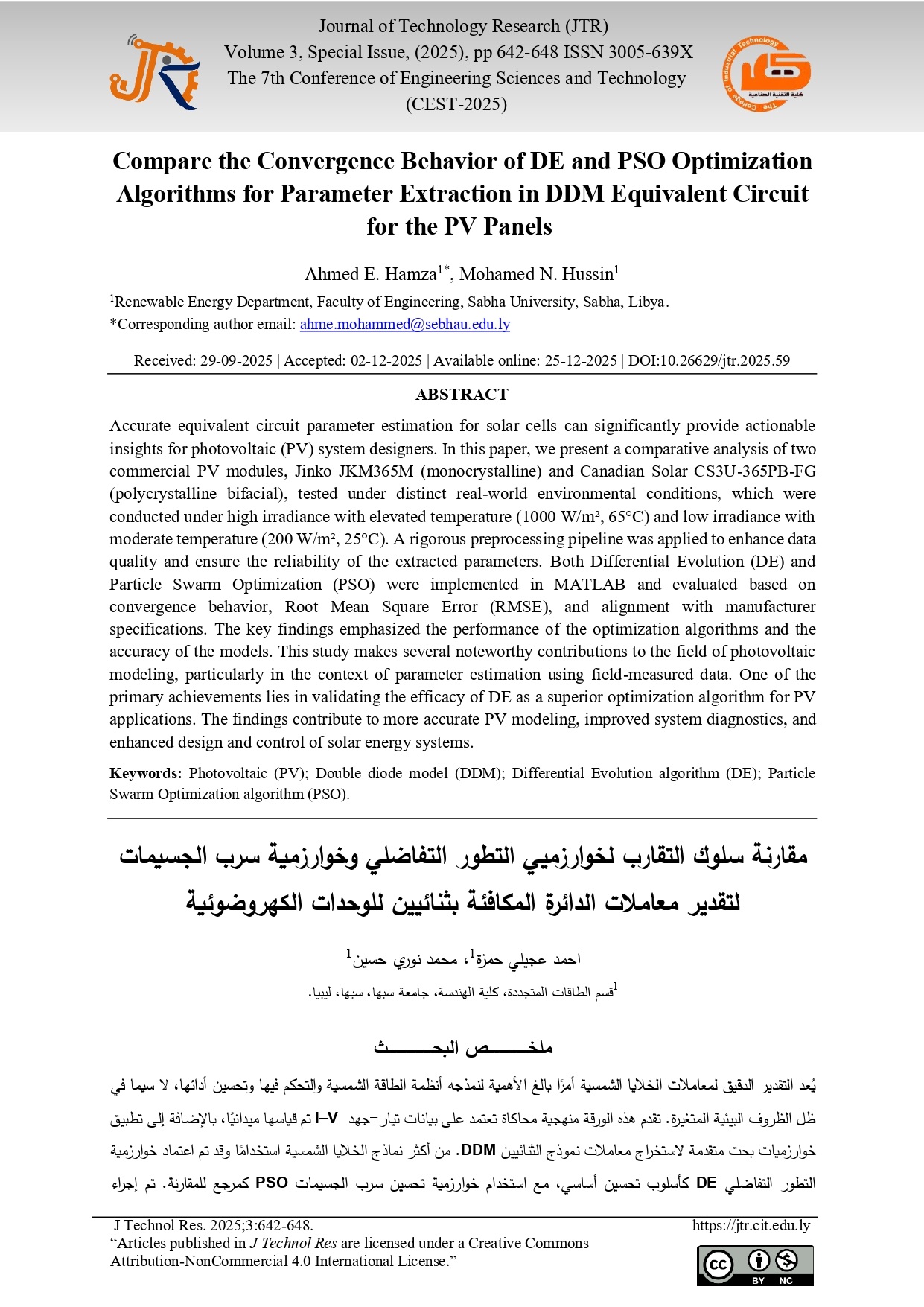 Compare the Convergence Behavior of DE and PSO Optimization Algorithms for Parameter Extraction in DDM Equivalent Circuit for the PV Panels