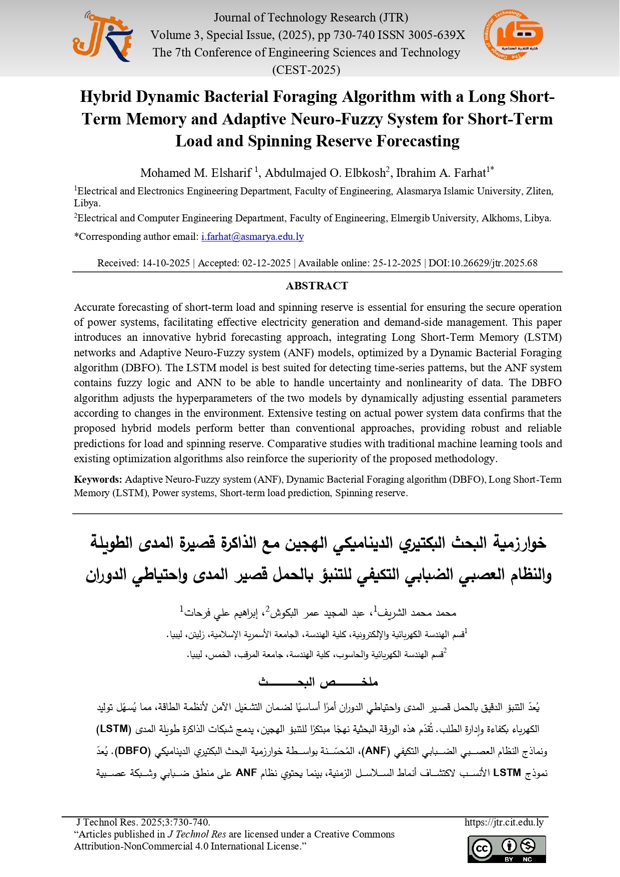 Hybrid Dynamic Bacterial Foraging Algorithm with a Long Short-Term Memory and Adaptive Neuro-Fuzzy System for Short-Term Load and Spinning Reserve Forecasting