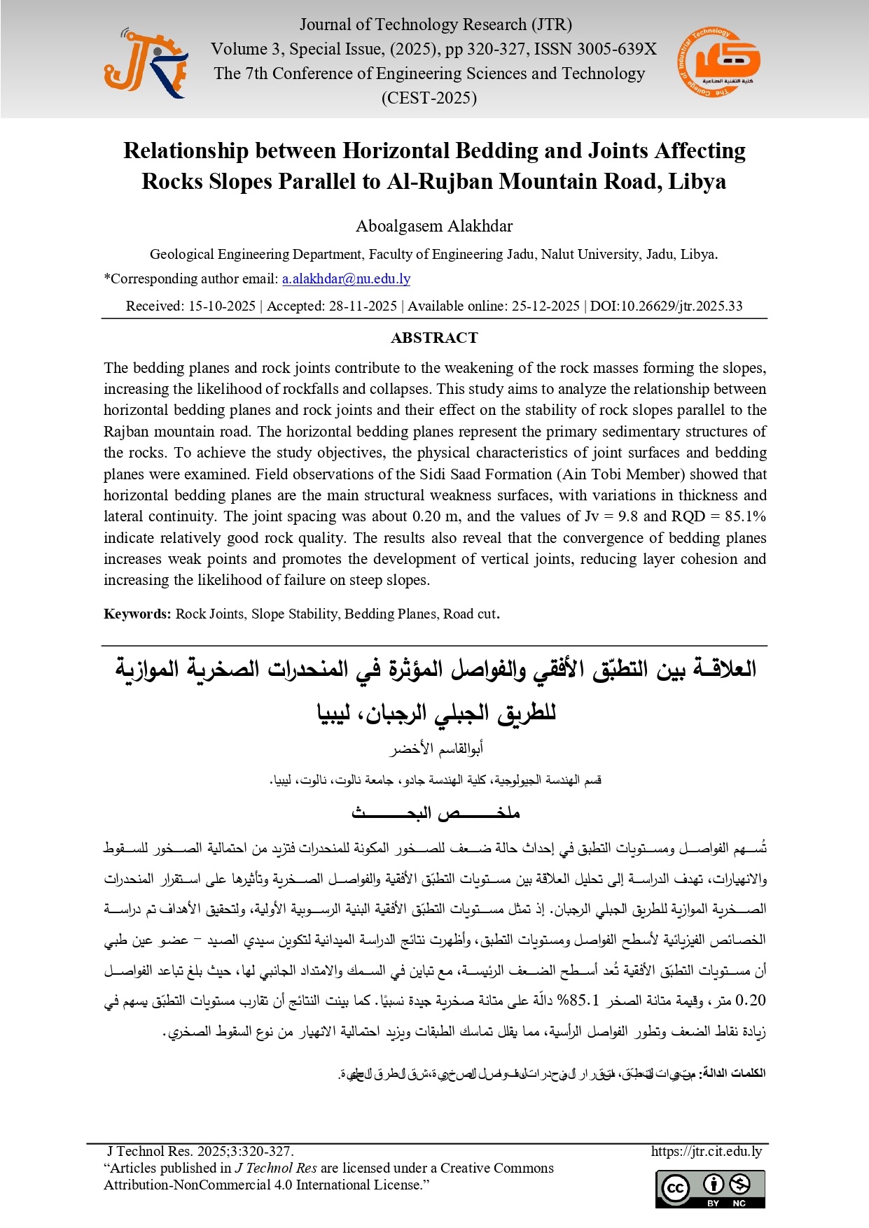 Relationship between Horizontal Bedding and joints Affecting Rocks Slopes Parallel to Al-Rujban Mountain Road, Libya